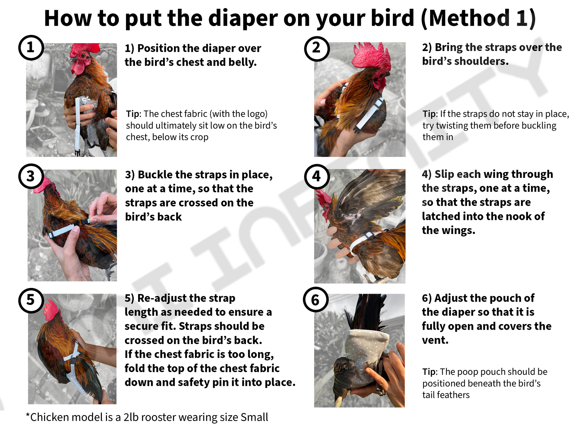 Make sure the Uni Infinity logo on the chest fabric sits just below your chicken’s crop. If the logo falls between the legs, it’s time to size up. The straps should feel snug but not tight—if even the loosest setting is too tight, you can use strap extenders, which are available to purchase in our store. Finally, the poop pouch should fully cover the vent; if it doesn’t, get the next size up.