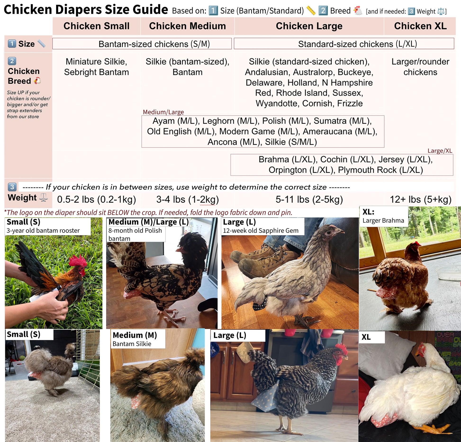 Bantam silkies typically wear size M. Refer to size chart pictures for reference. If you are still unsure, feel free to send us a photo of your chicken and we can recommend a size for you!